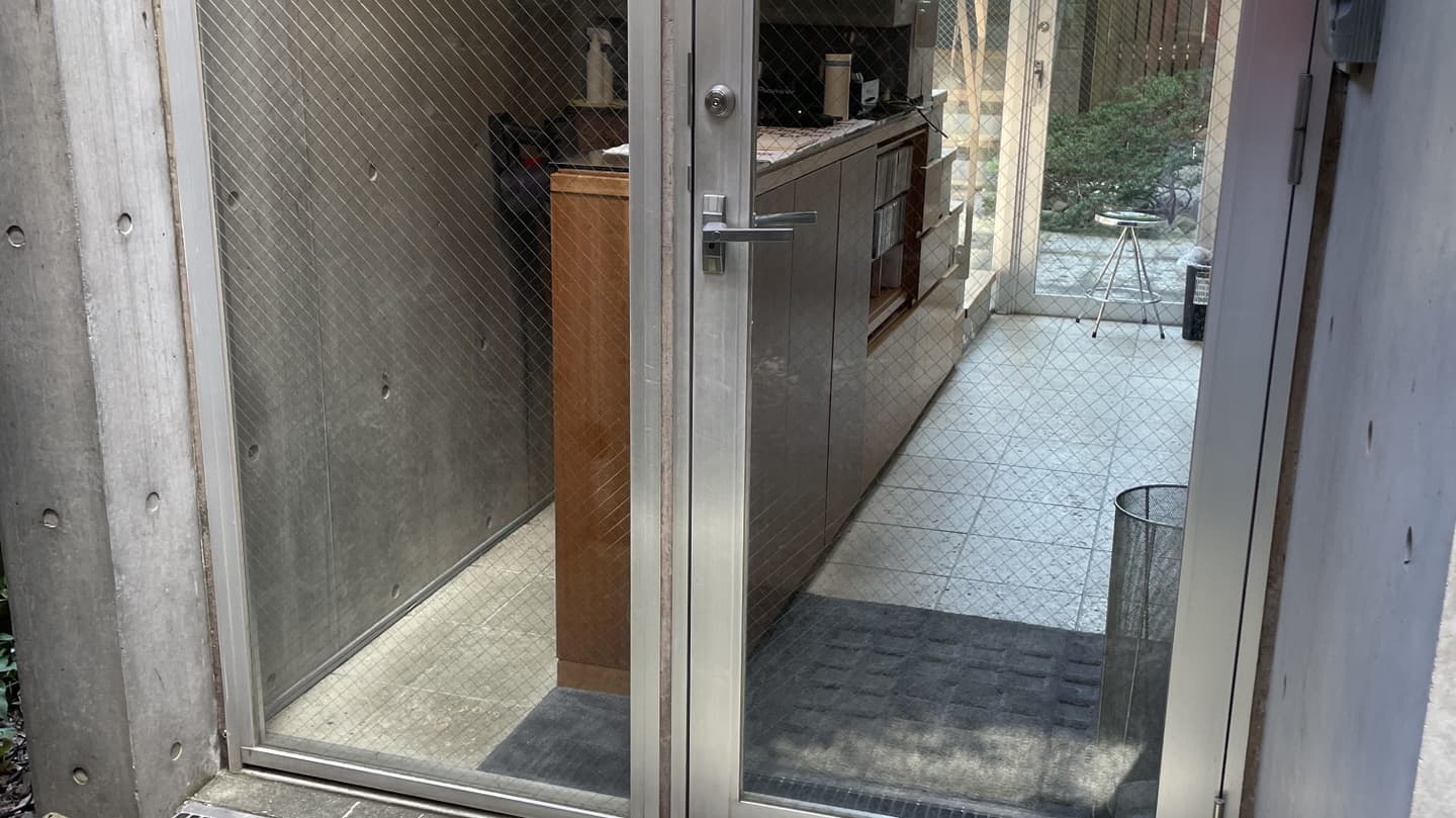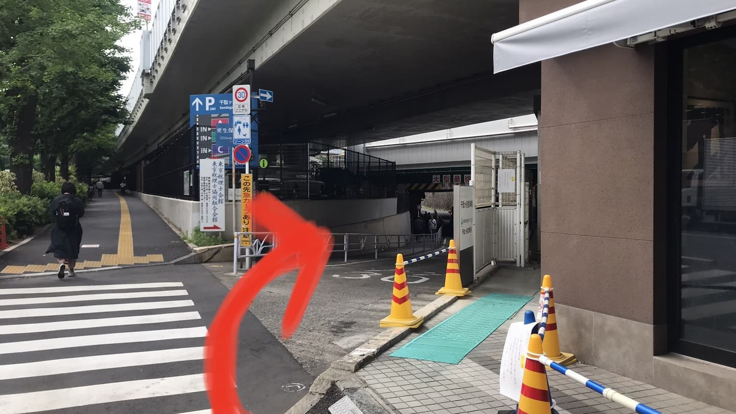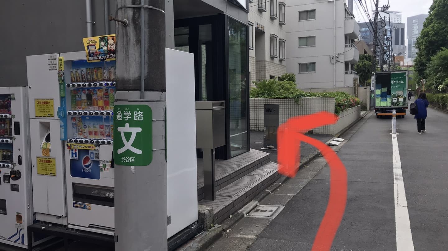 御苑の柵塀が途切れた、数十メートル先にある自販機のすぐ先を左に入る→